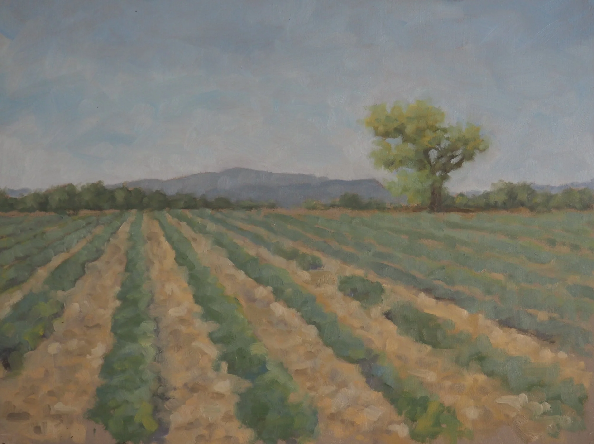 These two paintings were on the day after the lunar eclipse. The sun set on one side of the plateau behind Mont Ventoux off in the distance and the lunar spectacle started on the other side of the plateau with the moon in the shadow of the earth. A bit of sky gazing, sleep and then out with the easel on a warm, slightly overcast day.